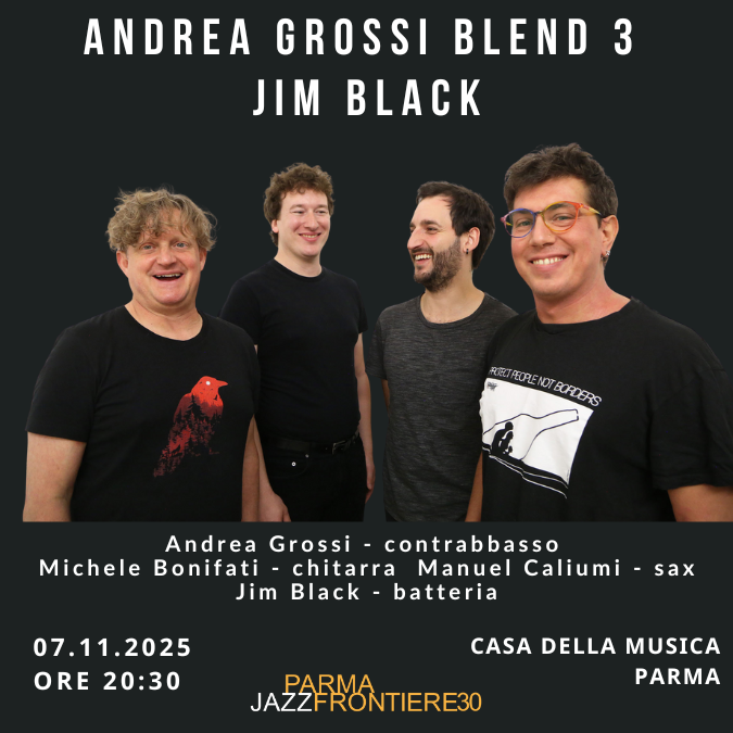 Il contrabbassista Andrea Grossi presenta una nuova incarnazione di Blend 3, il suo affiatato trio con Caliumi e Bonifati, per l’occasione trasformato in quartetto con la presenza del batterista Jim Black, musicista che ha definito alcune delle modalità della batteria contemporanea e contribuito a creare il suono newyorkese degli anni ‘90.